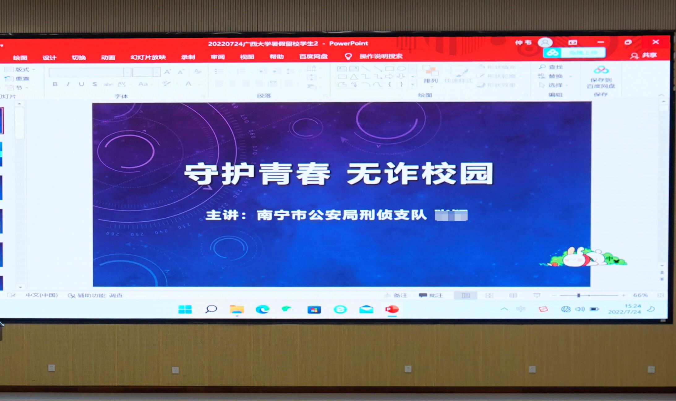 为普及反诈骗知识,降低大学生受诈骗率,2022年7月24日,南宁市公安局刑侦支队在资环材学院123报告厅举办“守护青春 无诈校园”反诈宣传讲座,小鸭看看