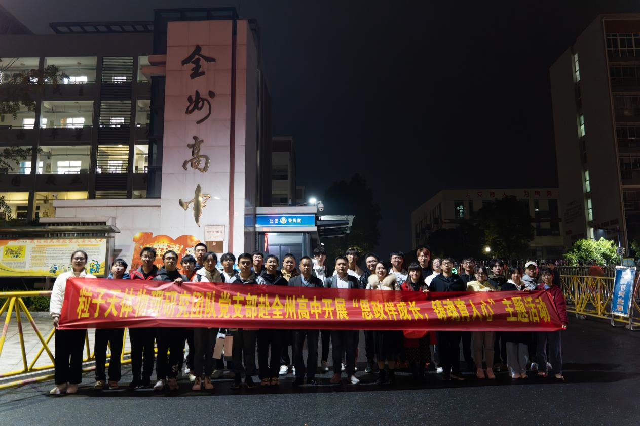 为发挥党支部的模范引领作用,加强对青少年的思想政治教育,12月3日,粒子天体物理研究团队党支部成员赴全州高中开展了一场题为“思政伴成长,铸魂育人心”主题活动。物理学院党委副书记蒋津辉,副院长、粒子天体物理研究团队党支部书记刘宏邦及部分学生党员参加了活动。