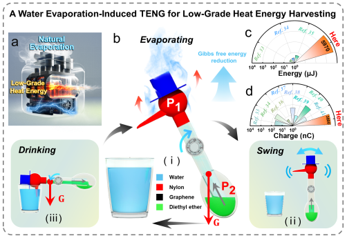 蓝色能源团队与北京纳米能源与系统研究所合作,提出了首个完全依靠自然蒸发驱动的摩擦纳米发电机。它通过传统的饮水鸟与摩擦纳米发电机结合,利用自然蒸发过程中产生的空间非均匀热源驱动的热机对外做功,可将环境中广泛分布的低品位热能有效地转化为电能。该水蒸发摩擦纳米发电机不仅具有出色的发电性能,还展示了其在自驱动抑制碳钢材料在氯化钠溶液中的自发腐蚀中的应用。这项技术可随时随地通过液体的自然蒸发发电,具有广泛的适应性和应用价值,为周围环境中的低品质热能收集提供了新的技术方案。研究成果以"Evaporation Triboelectric-Nanogenerator: Harvesting Low-Grade Heat Energy From Ambient Environment"为题于2023年12月在线发表于国际期刊《Advanced Materials Technologies》上。