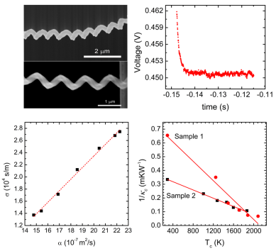 碳纳米线圈是一种具有独特螺旋结构的准一维碳纳米材料,在内部结构上区别于碳纳米管和碳纳米纤维,为多晶-非晶混合结构。独特结构带来的独特物理特性决定了碳纳米线圈在复合材料、电磁波吸收、场发射、传感器和柔性电子等方面广泛的应用前景。本研究在国际上首次报导了焦耳热退火对单根碳纳米线圈热物性影响的原位表征。研究中,我们发现晶体重构速率随退火功率变化呈现正态分布。结合瞬态电热表征技术和有限差分方法,我们发现,单根碳纳米线圈的热导率在1200至1800 K的温度范围内表现出8.7倍的增大。研究揭示出碳纳米线圈热扩散系数和电导率之间精确的线性关系,以及热导率倒数与退火温度之间精确的线性线性关系。