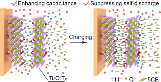 新能源团队提出将向列相液晶分子4-n-戊基-4′-对氰基苯(5CB)引入Ti3C2Tx薄膜和LiCl电解质中。复合膜电极充满电后,插层于Ti3C2Tx纳米片之间和溶解于电解质中的5CB分子,由于电流变效应方向会发生改变而垂直于纳米片,形成一个阻挡层,从而增加电解质的粘度,并抑制离子的交叉扩散/重分布和寄生法拉第反应。结果表明,所提出的方案可以有效抑制MXenes基超级电容器(SCs)的自放电,促进了MXenes基超级电容器在能量存储设备和集成电子器件中的应用。