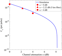 图3 保密容量与信道衰减 。 红点显示了使用可变光衰减器模拟光纤链路的实验结果。 红色三角形是超过5公里商用光纤的实验结果。蓝线代表基于我们的实验参数的理论模拟结果。