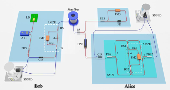 图1 实验装置示意图。LD:波长为1550nm的激光二极管;ATT:衰减器;PBS:偏振分束器;CIR:环形器,箭头方向是从1到2端口;BS:分束器;PM:相位调制器;FR:90°法拉第旋转器;EPC:电动偏振控制器;SMZI:Sagnac-Mach-Zehnder干涉仪;5 km fiber:5千米商用光纤;SNSPD:超导纳米线单光子探测器;白色虚线框:非对称马赫-曾德干涉仪;蓝色实线:单模光纤;红色实线:保偏光纤。理论上,该系统需要一根存储光纤作为编码模块中的量子存储器。为了简化,这里我们将其删除。