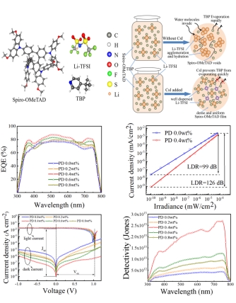 钙钛矿探测器(PDs)结合了钙钛矿半导体材料优异的光电性能和溶液处理的优点,已成为一种革命性的新型光电器件,并应用于各个领域。空穴传输材料在PDs的中起着至关重要的作用。性能优异的空穴传输材料可以显着提高光生空穴的提取率和迁移率。有机小分子材料Spiro-OMeTAD ,具有高溶解度和优异的成膜性能,是光电探测器空穴传输层(HTL)的理想材料。在这项工作中,我们将少量 CsI 与 Li-TFSI 和 TBP 作为添加剂一起引入 Spiro-OMeTAD溶液中。研究发现CsI和TBP形成复合物,从而阻止了TBP的快速蒸发,抑制了Li-TFSI在Spiro-OMeTAD中的聚集。我们制造的光电探测器表现出从近紫外到近红外(300-800 nm)的宽带响应范围,快速响应(上升/下降时间为 54.1/10.7 μs)和低暗电流密度(9.72 ×10-10 A cm-2)。探测器可在零偏压下自供电,外量子效率(EQE)为88%,响应度(R)为0.48 A W-1,检测率(D*)接近2.7×1013琼斯。本研究提供了一种制造大面积高性能PDs 的简单方法。