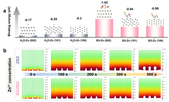 图1 (a)在优化吸附模式下,H2O和SG在不同Zn晶面上的吸附能比较;(b)ZSO和SG/ZSO电解液中的Zn2+浓度分布
