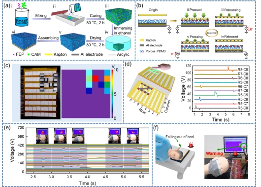 本研究提出了一种分辨率高、压力敏感、舒适的智能枕用于在睡眠期间实时监测头部运动。首先利用牺牲模板法制作了掺杂有氟化乙烯丙烯(FEP)粉末的多孔聚二甲基硅氧烷(PDMS),并组装了一种柔性透气的摩擦纳米发电机(FB-TENG)。通过将FB-TENG阵列化,形成一个具有触摸感应和运动轨迹监测功能的自供电压力传感阵列。智能枕是在普通枕头上铺设自供电压力传感器阵列而形成,能够对睡眠时静态头部位置和动态头部运动轨迹实时监测。此外,智能枕还具有掉床预警功能。这项工作不仅为睡眠监测提供了一种可行的传感装置,而且预计未来将为移动医疗保健领域带来实用的疾病管理策略。