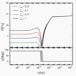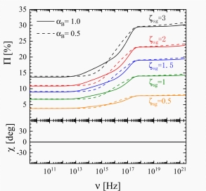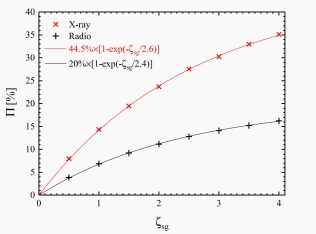 图2:激波产生磁场(sgMFs)在不同各向异性指数ζ sg下的X射线和射电波段的偏振度。