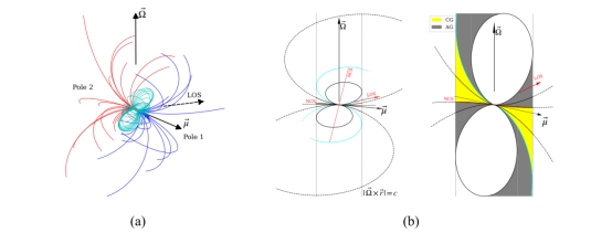为第一单位,来自国家天文台、北京大学、贵州师范大学和中国科学院大学的研究人员,利用中国天眼FAST对全相位辐射的射电脉冲星B0950+08进行偏振观测,绘制出了脉冲星B0950+08的三维磁层结构和子午面辐射几何(磁轴和自转轴共面),如图1所示