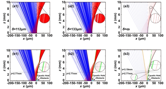 图 1 不同相干长度的部分相干艾里光束的焦散图样:112μm,133μm和∞。(a1)-(a3)无障碍物的焦散图样。 (b1)-(b3)有障碍物的焦散图样。