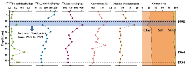 图一 PYA柱芯中239+240Pu的活度,210Pbex的活度,40K的活度,Ca的含量,中值粒径,粒径分布情况(沙:2000-62.5μm,粘土:62.5-3.9μm,淤泥:3.9-0.2μm)。