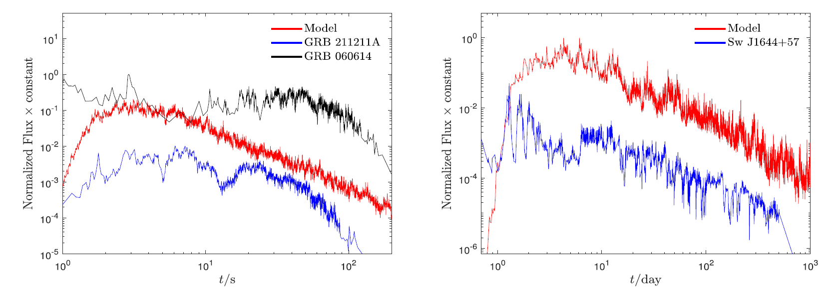 与潮汐瓦解事件相似的GRB 211211AGRB 060614光变曲线衰减阶段呈现出剧烈的涨落特征,该工作将其根源追溯至潮汐瓦解后回落物质在能量空间的质量分布dM/dE所存在的波动。该研究提出,在瓦解过程中,自引力、激波加热以及湍流等因素会在回落物质的质量分布上引入扰动,其功率密度谱遵循fEβ的形式。模拟分析表明,喷流功率能够有效地保留这种回落过程的波动特性,尽管吸积过程会抑制短时标的涨落。研究发现,当波动指数β约为-1时,所产生的喷流光变曲线能够很好地再现GRB 211211AGRB 060614以及TDE Sw J1644+57的观测特征,并且对观测数据进行的功率谱分析也独立地验证了β~-1这一结果。