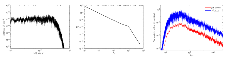 1dM/dE在能量空间中的分布(左)及其相应的功率谱(中)。右图则展示了模拟得到的回落率以及相应的光变曲线。